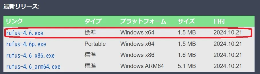 今回はインストールメディアをWindows11の端末で作りましたので、「rufus-4.6.exe 標準 Windows x64」を使いました。