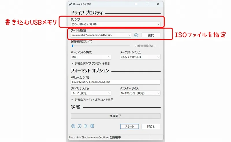 デバイスで書き込むUSBメモリを選択。ブートの種類で対象のISOファイル、今回は「linuxmint-22-cinnamon-64bit」を選択し、スタートをクリックします。