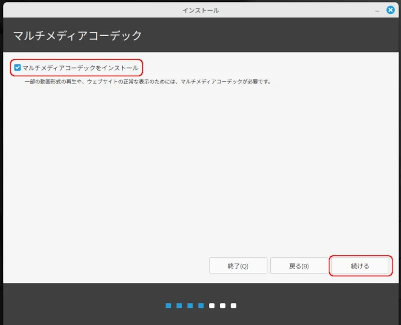 「マルチメディアコーデックをインストールする」にチェックを入れて、「続ける」をクリック。