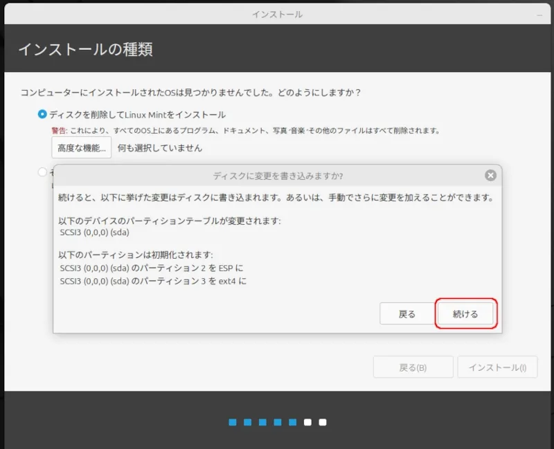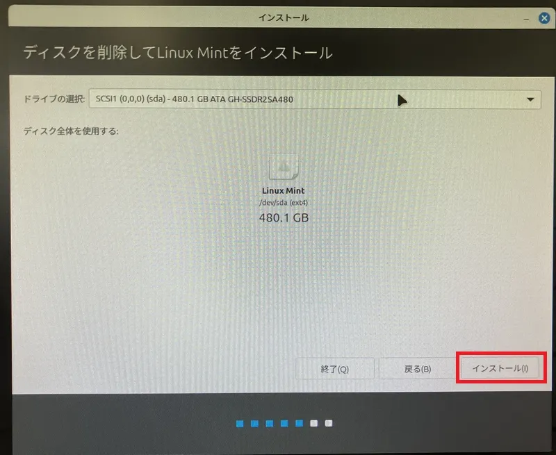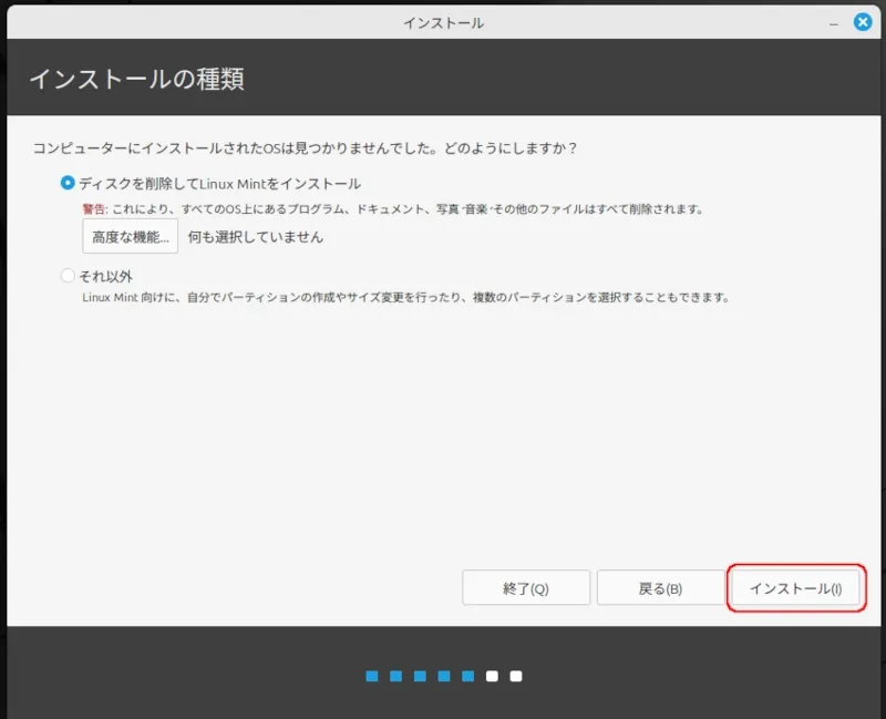 「ディスクを削除してLinux Mintをインストール」を選択して「インストール」をクリック