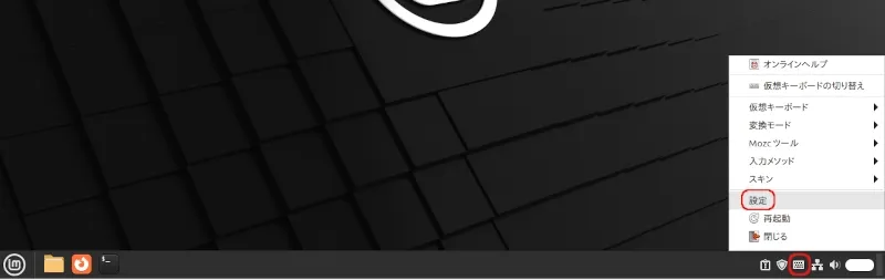デスクトップ画面右下のシステムトレイに表示されるキーボードのマーク(Fcitxアプレット)を右クリックします。