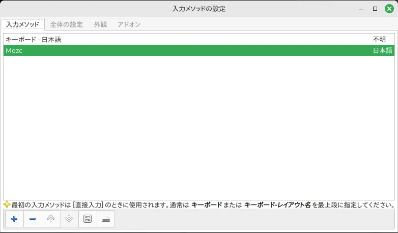 「入力メソッドの設定」が開くので、「キーボード-日本語」の下に「Mozc」が表示されていることを確認します。