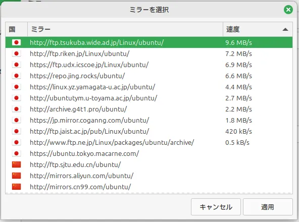 ミラーとは、ソフトウェアやアップデートを配布しているサーバーのことです。物理的に近いサーバーの方がダウンロード速度が速くなるため、国内のサーバーを選ぶことを推奨します。