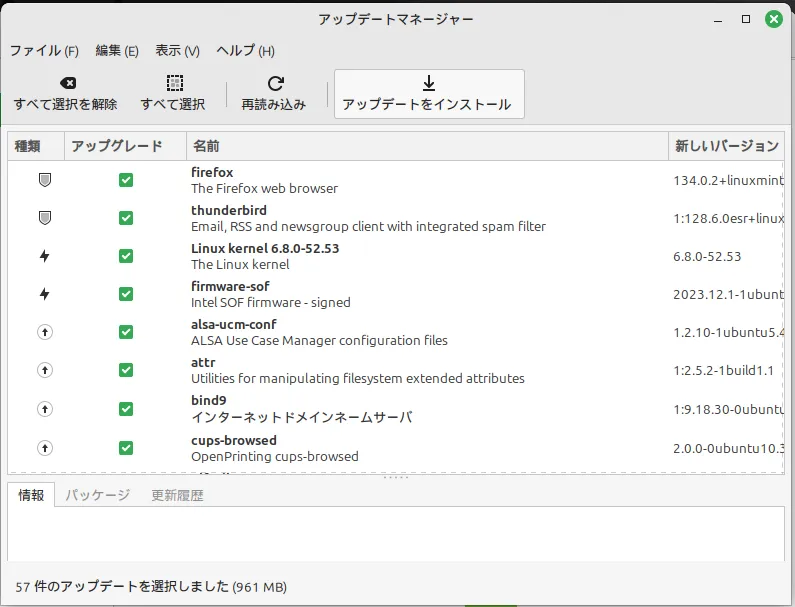 アップデートマネージャーは、初期設定時だけでなく、定期的に実行することでLinux Mintを最新の状態に保つことができます。