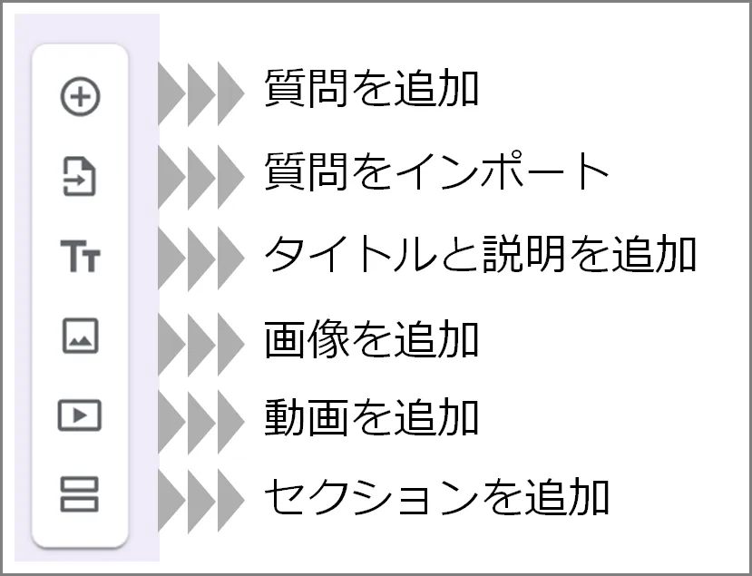 Googleフォームの右側に縦に並んでいる「+(質問を追加)」「画像を追加」「動画を追加」「セクションを追加」などのアイコンが入ったバーのことは、一般的に 「ツールバー」 または 「フローティングツールバー」 と呼ばれています。
