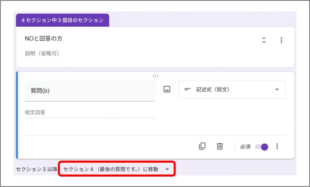 - セクション3(質問bの後)も「次のセクション:セクション4」へ