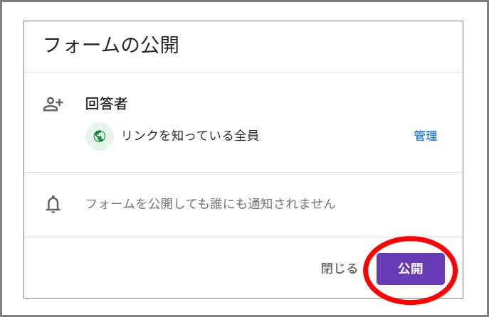 ②「フォームの公開」が開くので、「公開」をクリックすると回答の受付が開始されます。