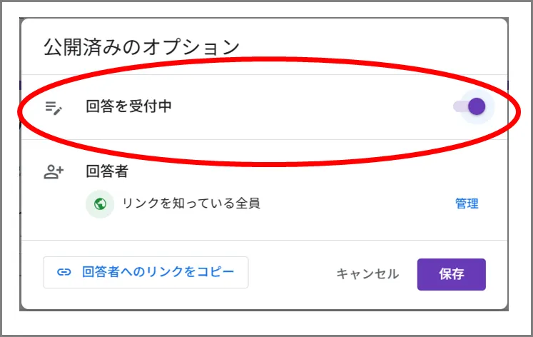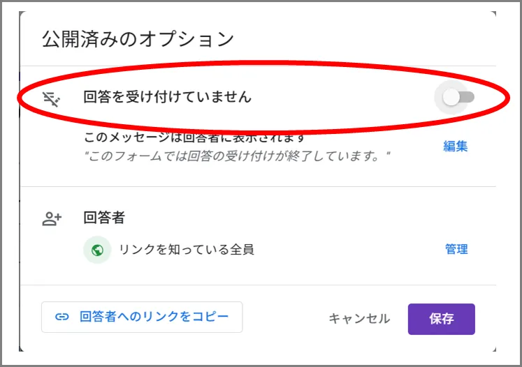 ②「回答を受付中」をオフにして、「保存」することで回答の受付が停止されます。