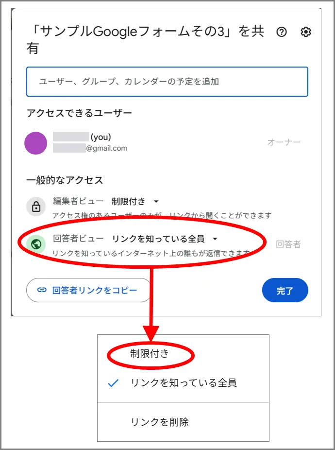 ②「回答者ビュー」を「リンクを知っている全員」から「制限付き」に変更します。