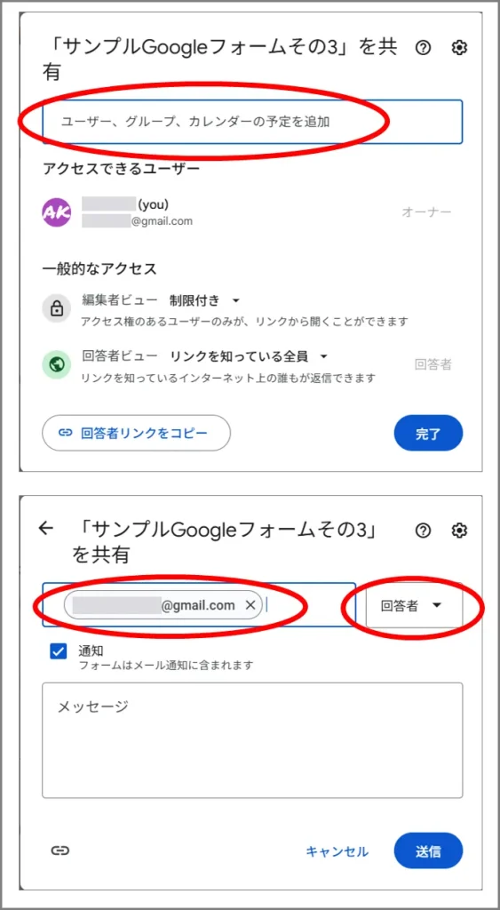 ③「ユーザー、グループ、カレンダーの予定を追加」の部分に、回答者のGoogleアカウントを入力し、権限を「回答者」とし、「送信」で完了です。