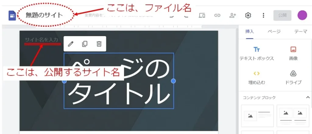 Googleサイトの画面が起動しますので、左上の「無題のサイト」という部分を任意の名称に書き換えます。